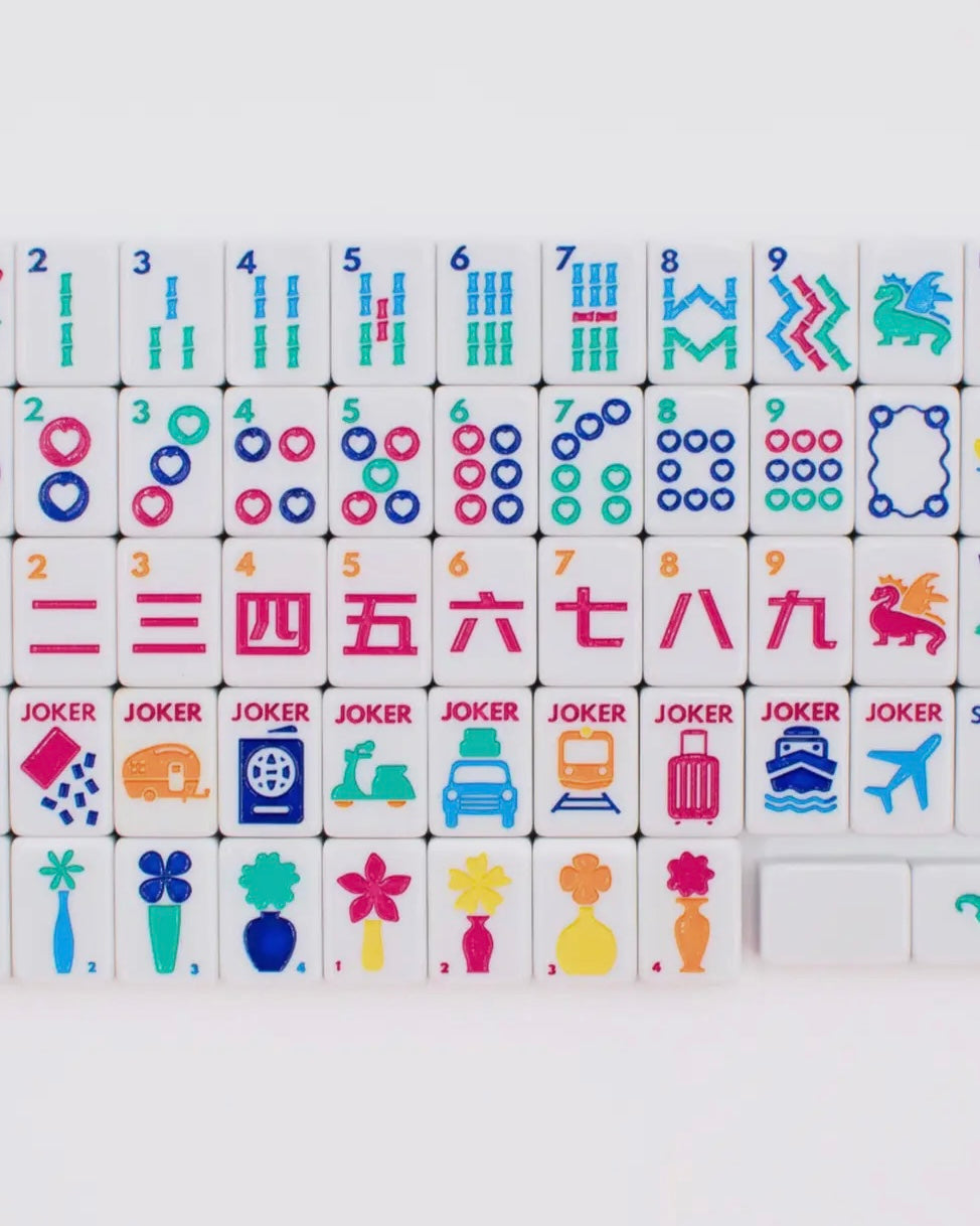 - 10 Jokers (10 unique designs all in the travel theme including a Passport, Boat, Plane, Trailer, Road trip-ready-car, Backpack, Luggage, Camera, Scooter and if you look carefully you will notice a tile with an image of a mahjong set to complete the Joker tiles).