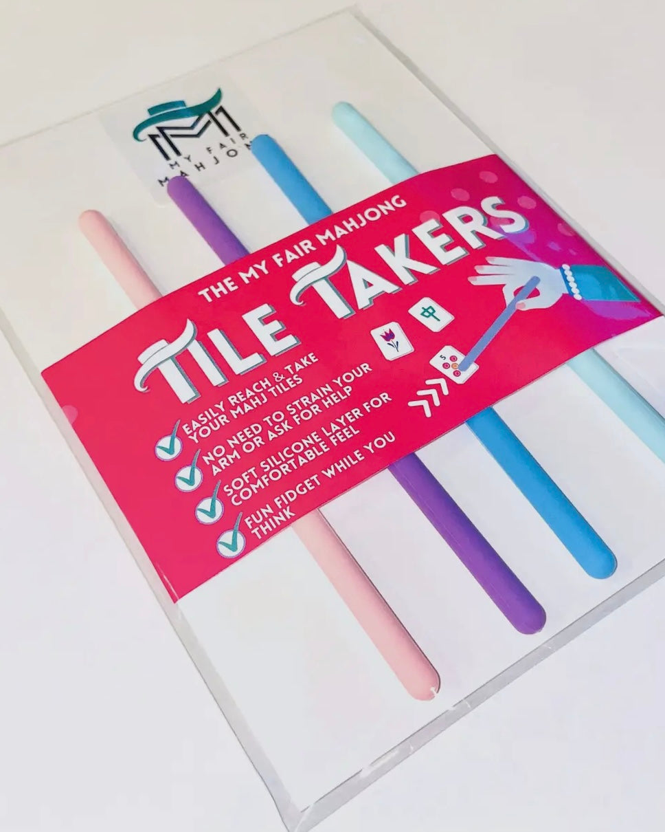 This set of 4 colorful tile takers comes with 4 colors (pink, blue-green, dark blue and purple) and is a great novelty gift for any mahjong player. After playing a Mahjong game with Tile Takers, you'll never want to play without them again. They are 5 inches in length each and have a smaller diameter than a standard pencil so they fit very comfortably in the hand, and feel fun to hold and fidget with as you are contemplating your Mahjong hands and waiting to use them to TAKE THOSE TILES! Helpful to reach your tiles, and great as a fidget while waiting for your turn. TWIST it around to take your next tile.