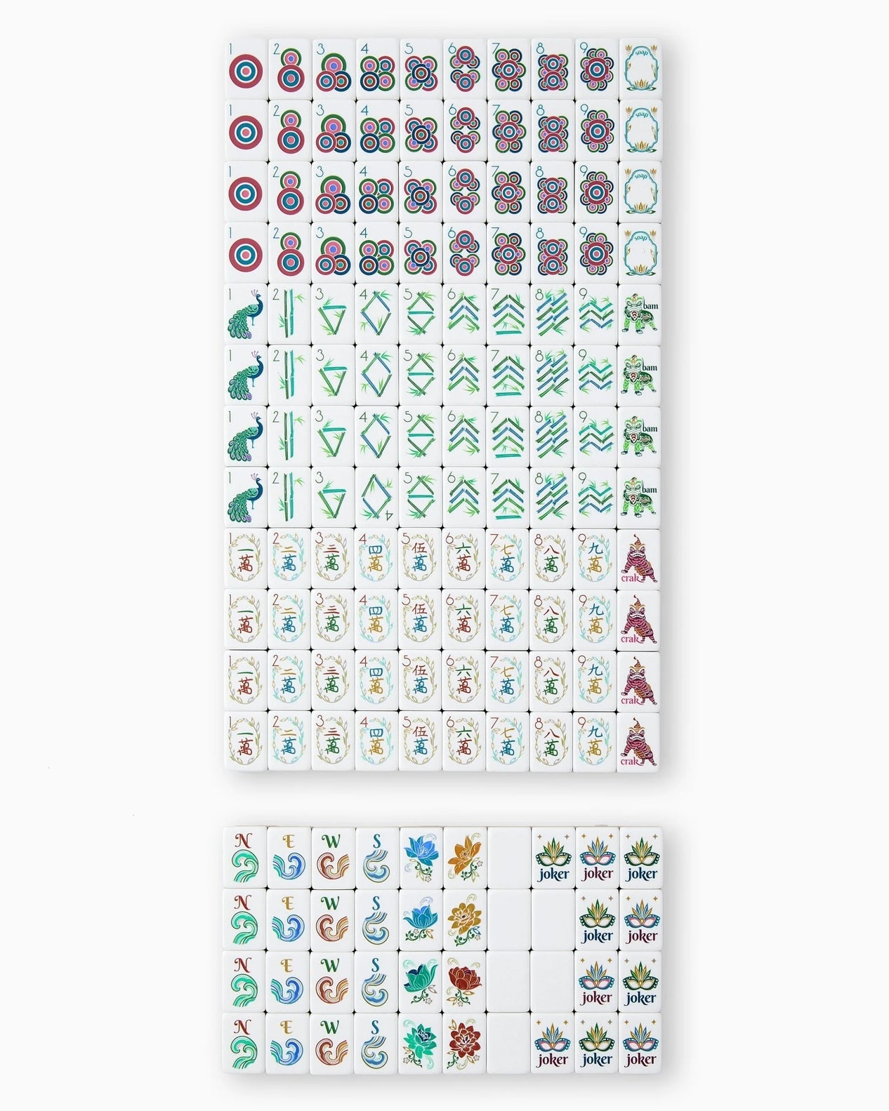 What's included: Tiles, a Dice/Coin Bag, and 4 Instructional Cards (you must purchase the NMJL Playing Card separately if you play American Mahjong).