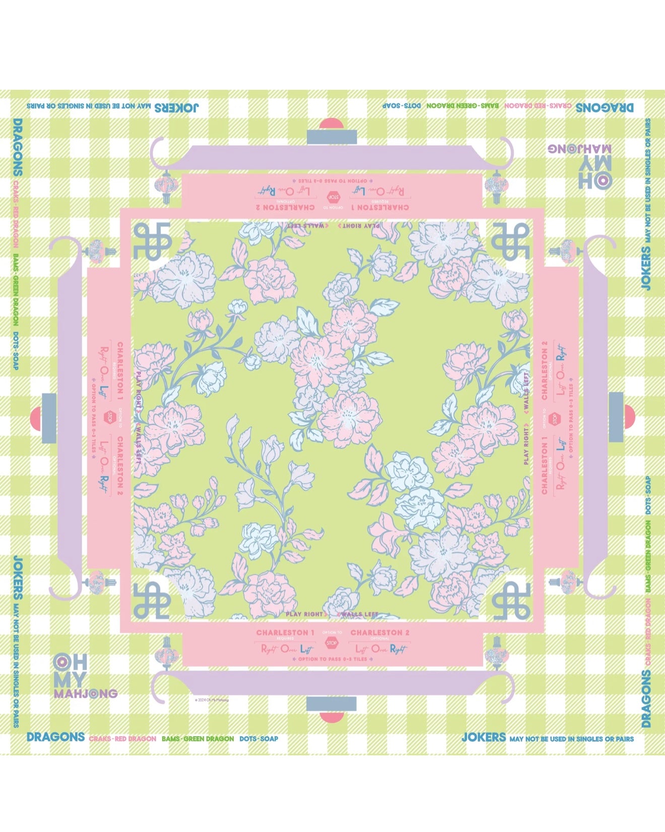 Introducing the Garden Party Mahjong Mat—a delightful combination of vibrant pastel hues and enchanting florals, intertwined with a charming green gingham pattern. This neoprene mat features a non-slip bottom to ensure your tiles stay perfectly in place, game after game. Adorned with delicate blossoms and inviting colors, it exudes a frilly femininity that is both elegant and playful. Along the sides of the mat, you’ll find the signature Oh My Mahjong instructional reminders, guiding you through each round.