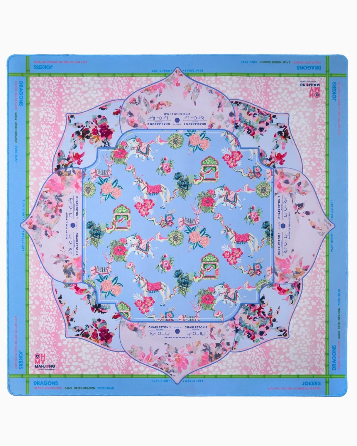 Introducing the Vivara Mat — a vibrant and whimsical celebration of pattern and play, designed for the Mahjong enthusiast who loves bold beauty with a worldly twist. Featuring a charming mix of elephants, blooming florals, and painterly antelope print in shades of soft pinks and layered blues, this mat brings an elevated sense of joy and wanderlust to your game night aesthetic. It’s artful yet playful — a visual escape that feels part garden fête, part global adventure.